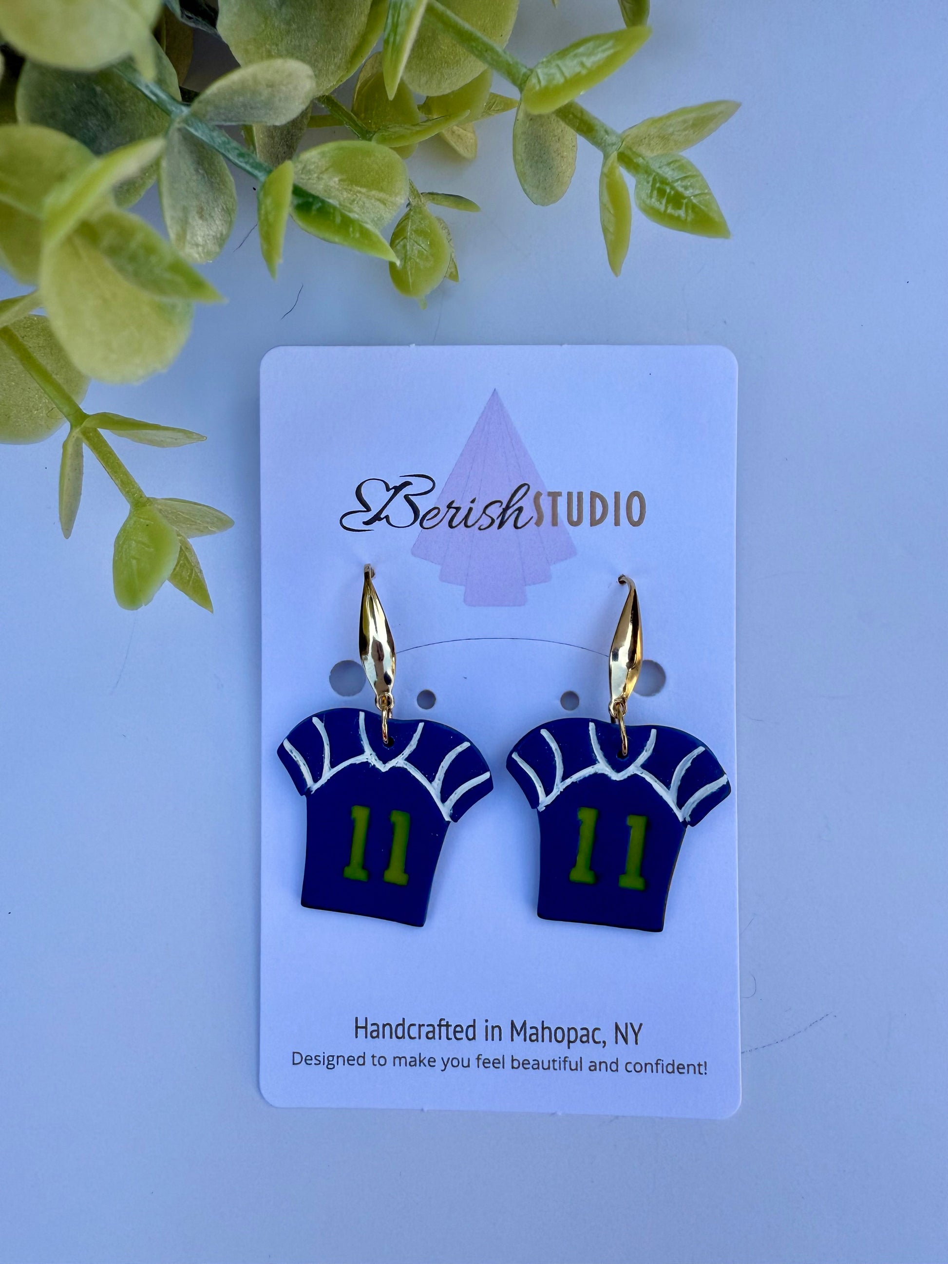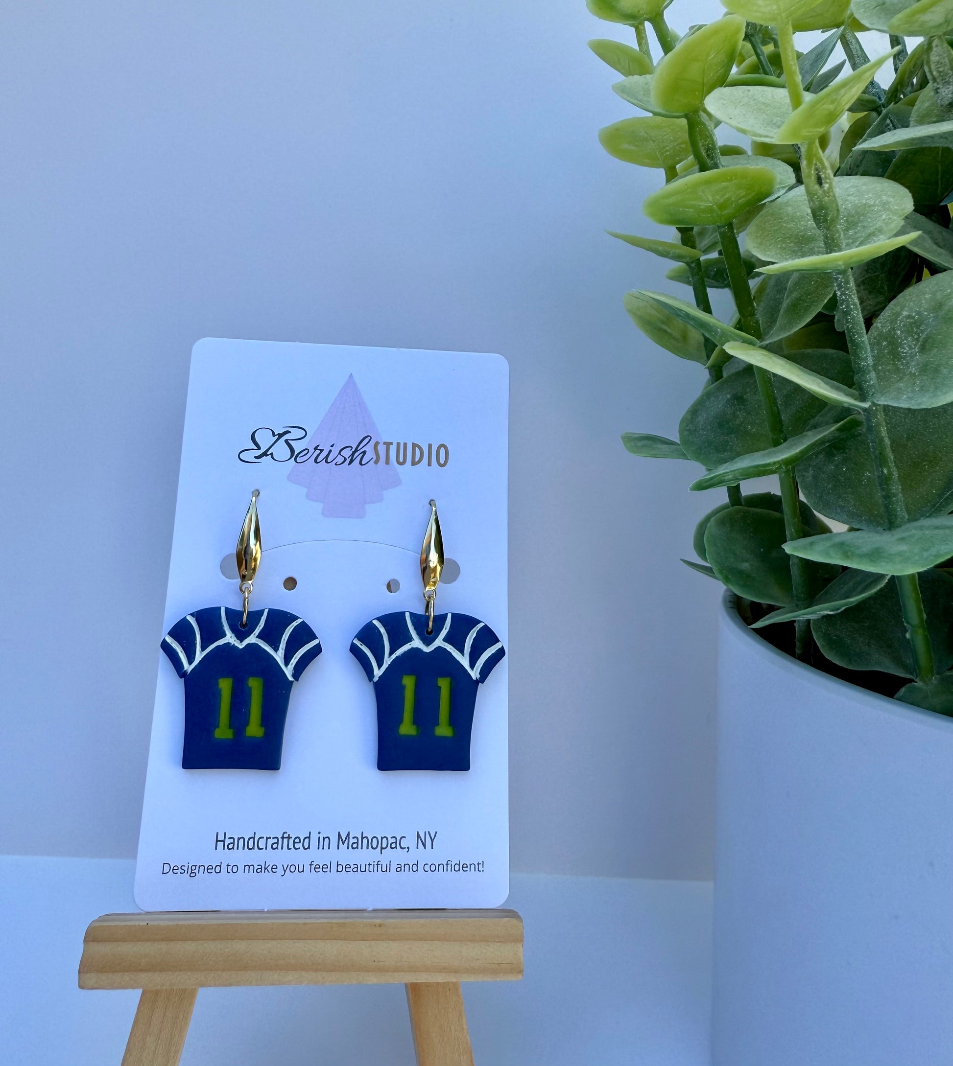 Show off your team spirit in style! These handmade polymer clay earring feature a mini football jersey design that can be customized with your favorite team colors and numbers. Lightweight and comfortable for all-day wear. They are perfect for game day, tailgates, or everyday fan pride!
